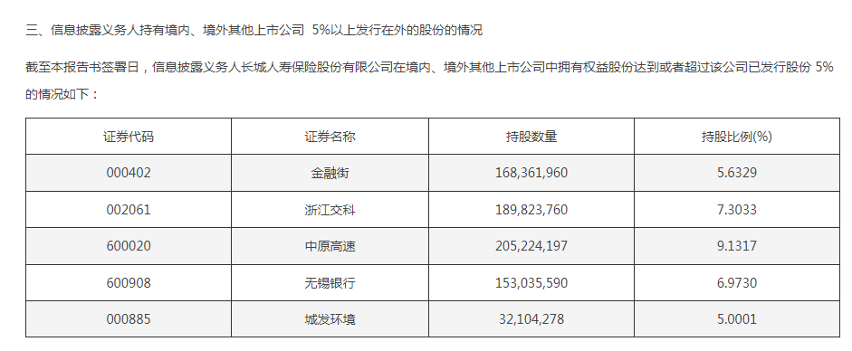 目前,长城人寿拥有股份超过5%的境内、境外上市公司包括金融街、浙江交科、中原高速、无锡银行、城发环境、江南水务等6家。