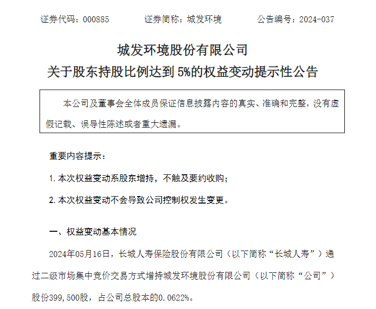 同日晚间,城发环境发布公告称,长城人寿于5月16日通过二级市场集中竞价交易方式增持城发环境股份39.95万股,加上此前已持有股票,长城人寿合计持有城发环境共计3210.43万股,占公司总股本的5.0001%。