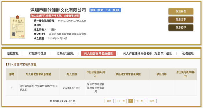 国家企业信用信息公示系统网站显示,5月31日,深圳市哇咔哇咔文化有限公司因通过登记的住所或者经营场所无法联系,被深圳市市场监督管理局龙华监管局列入经营异常名录。